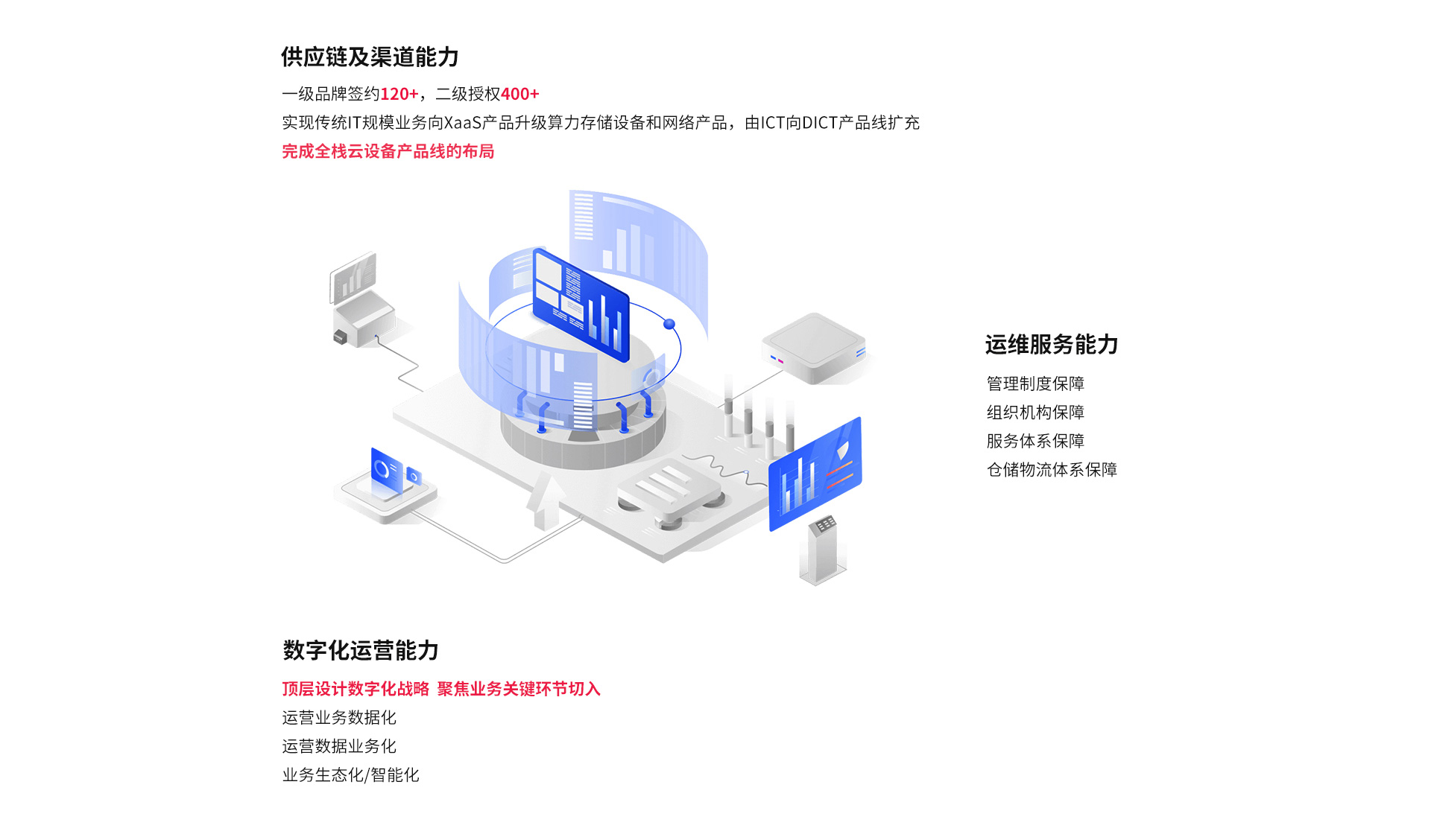 以云計算設備為主,面向京東、天貓等大型電商平臺提供泛ICT產品及服務,為全國數千家核心經銷商、下游渠道商、中小企業提供通路產品。